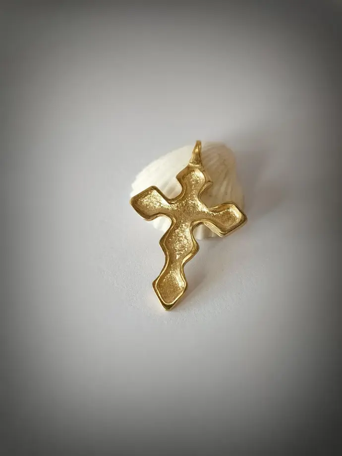 Cruz realizada en plata de ley y bañada en oro amarillo. De formas irregulares muy cómoda de llevar, de tamaños reducidos 27 x 21 incluye pasador trasero para poder llevar una cadena o cordón. Dejando a un lado su valor ornamental, su gran valor es el que representa.
