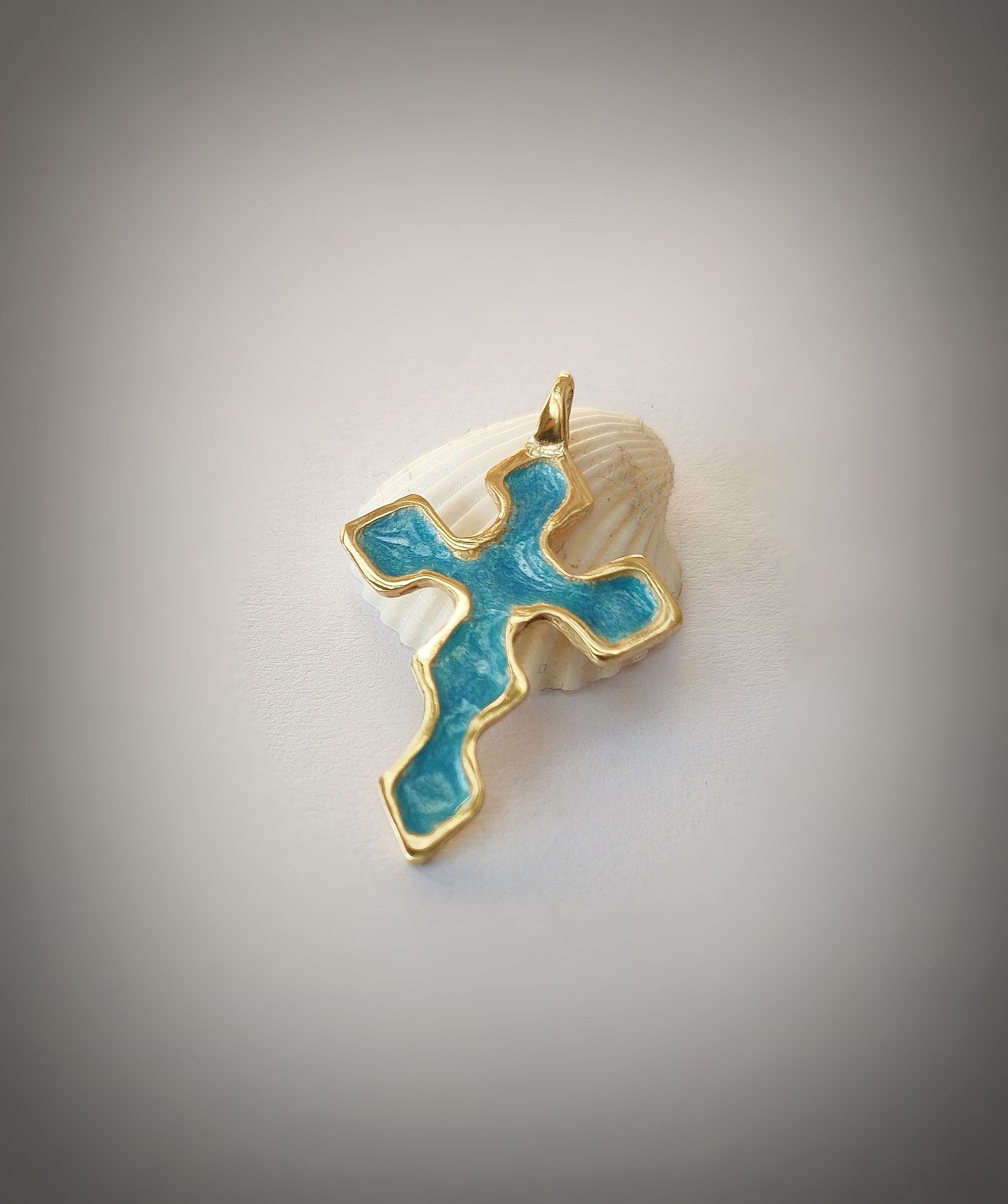 Cruz artesanal realizada en plata de ley bañada en oro y esmaltada al fuego.