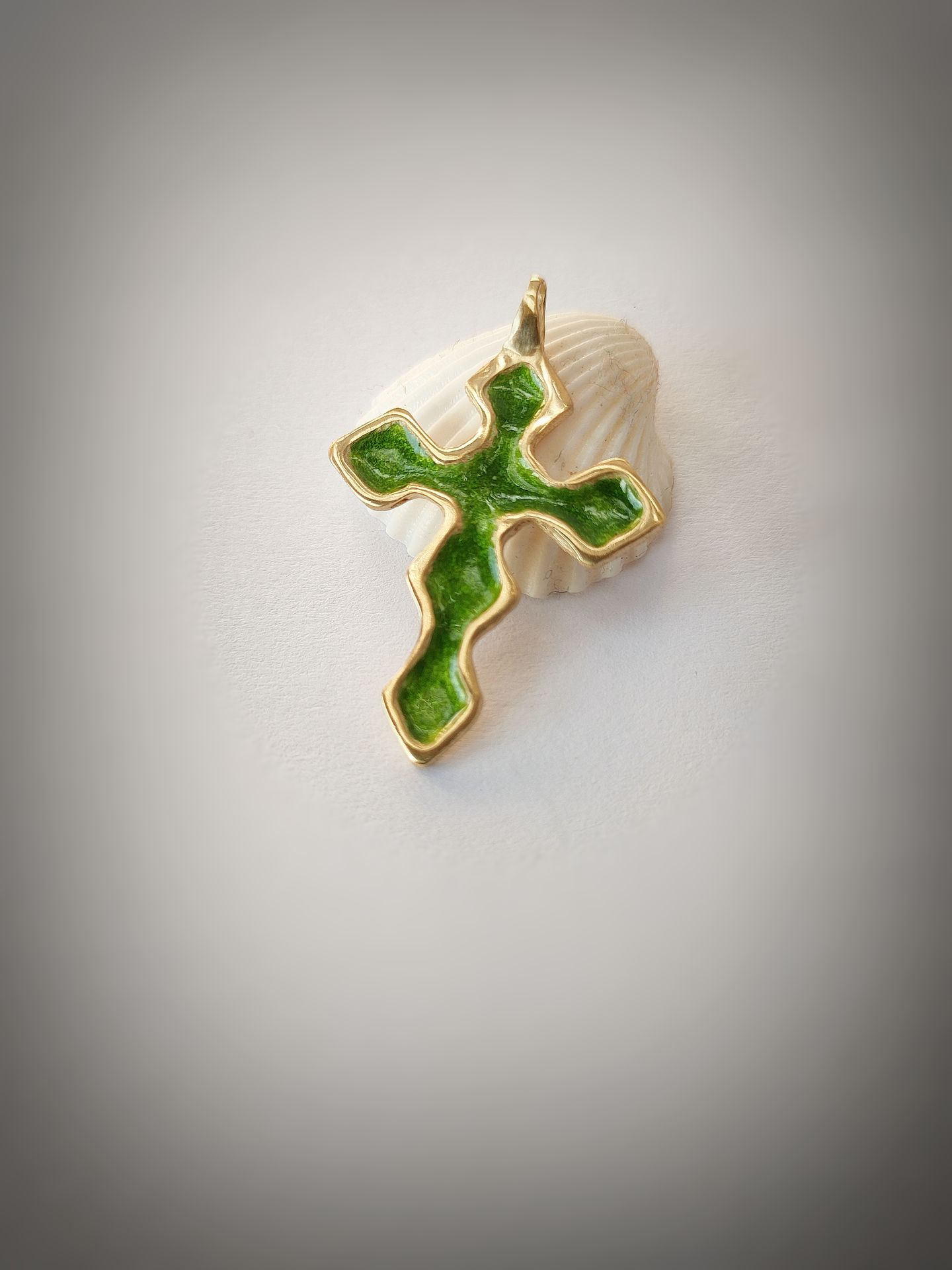 Cruz artesanal realizada con plata de ley esmaltada al fuego.