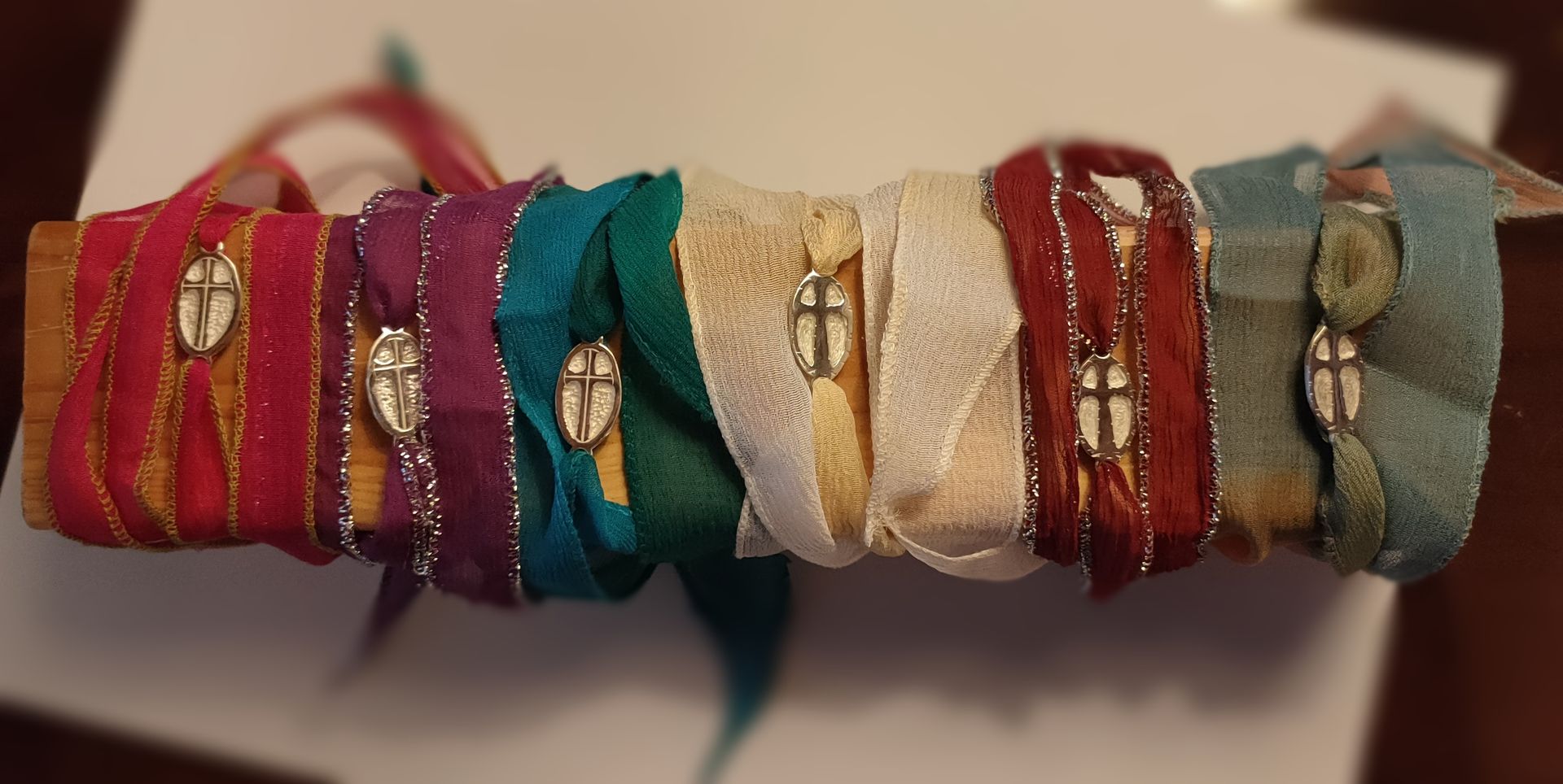 Pulsera de seda en color crudo y amarillo claro, con cruz realizada artesanalmente en plata de ley.