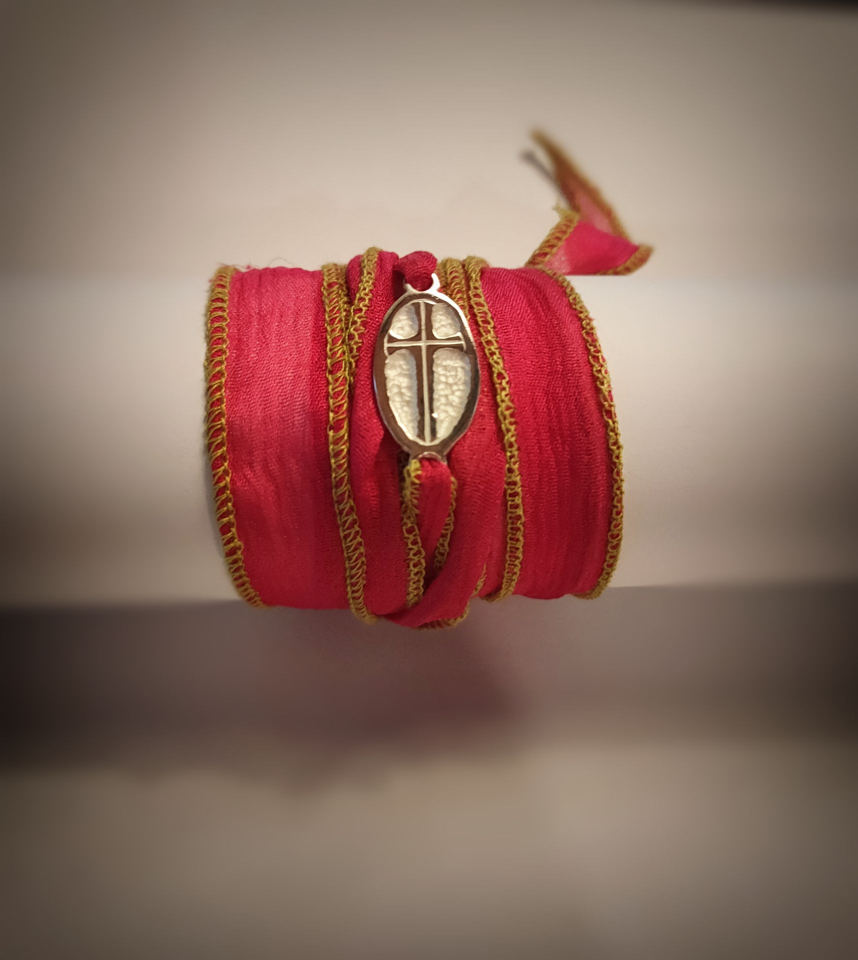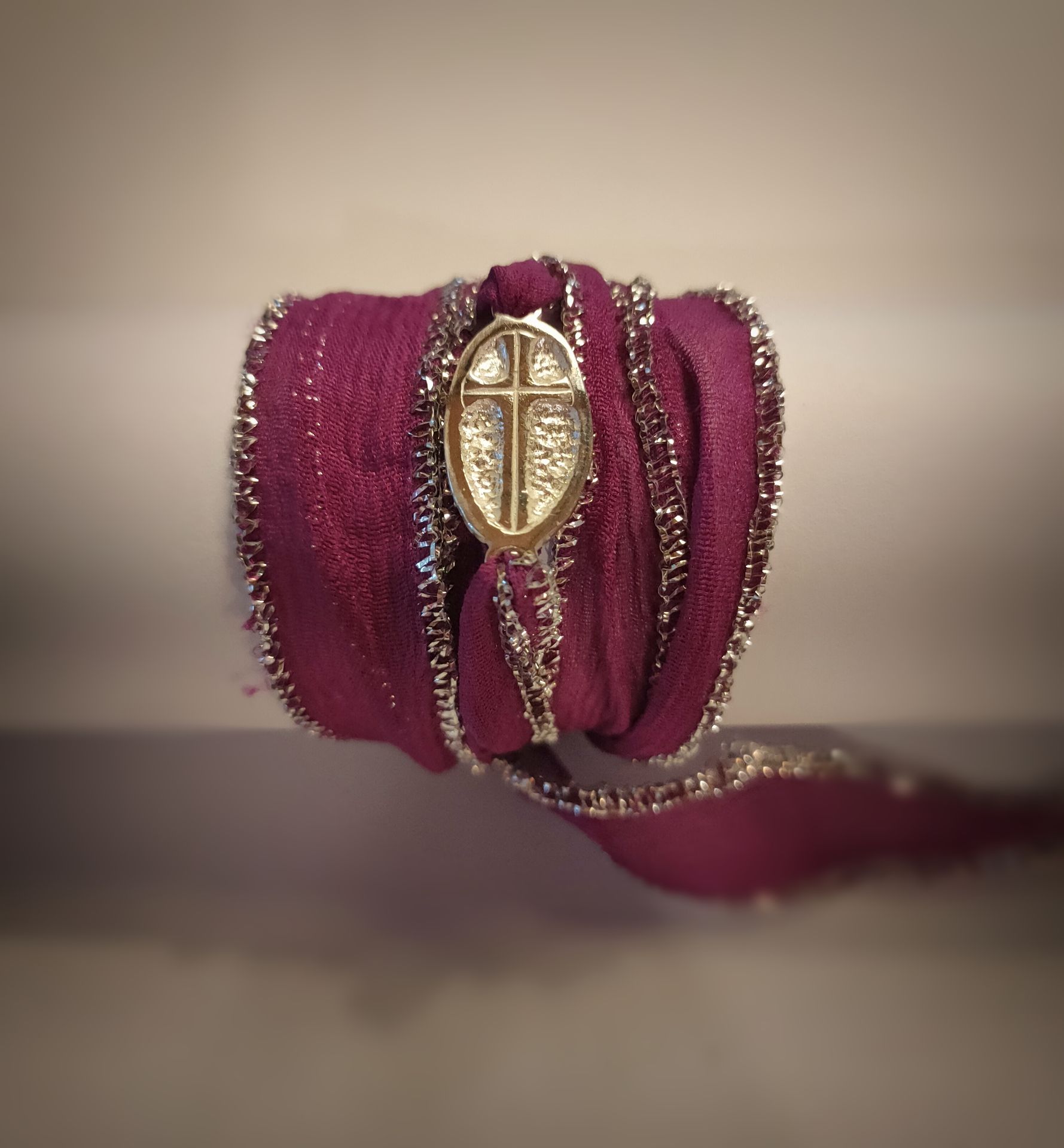 Pulsera de seda en color burdeos, con cruz realizada artesanalmente en plata de ley.