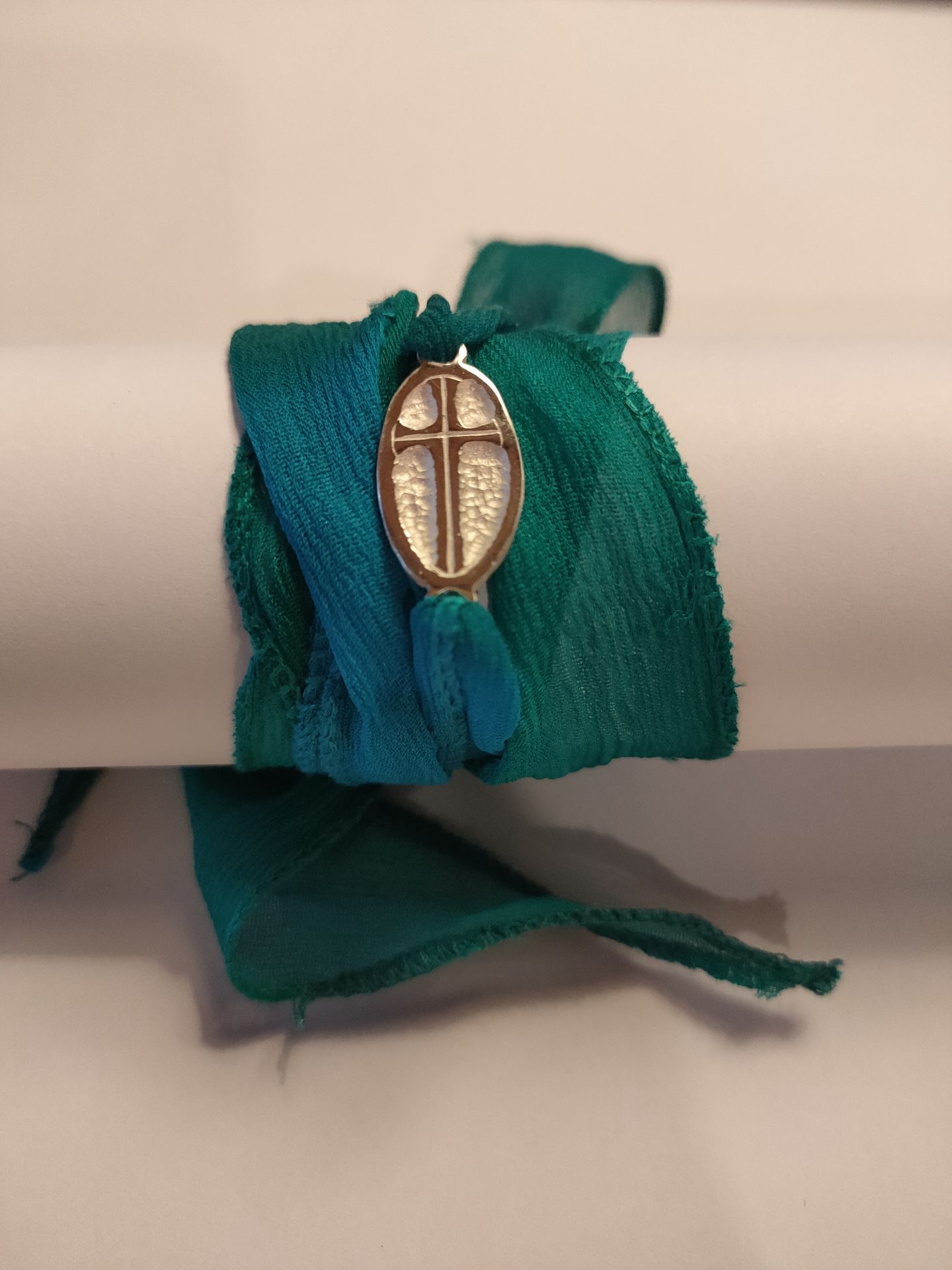 Pulsera de seda en color azul turquesa, con cruz realizada artesanalmente en plata de ley.