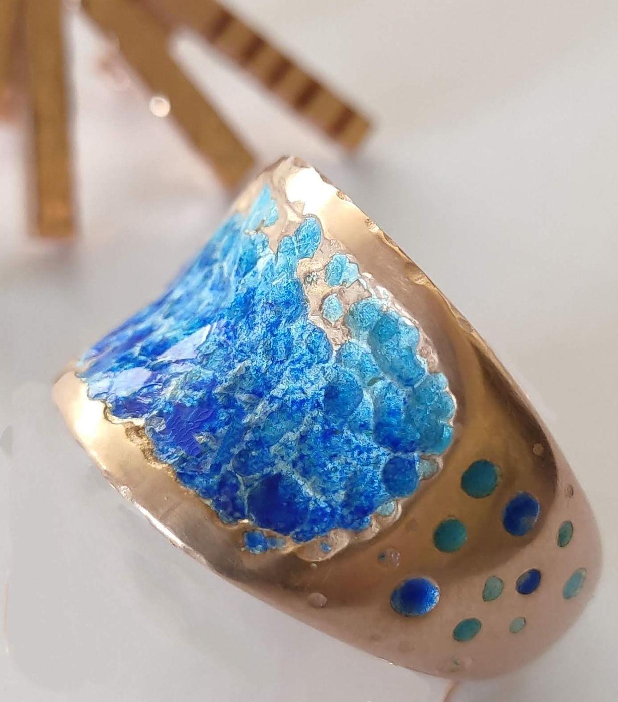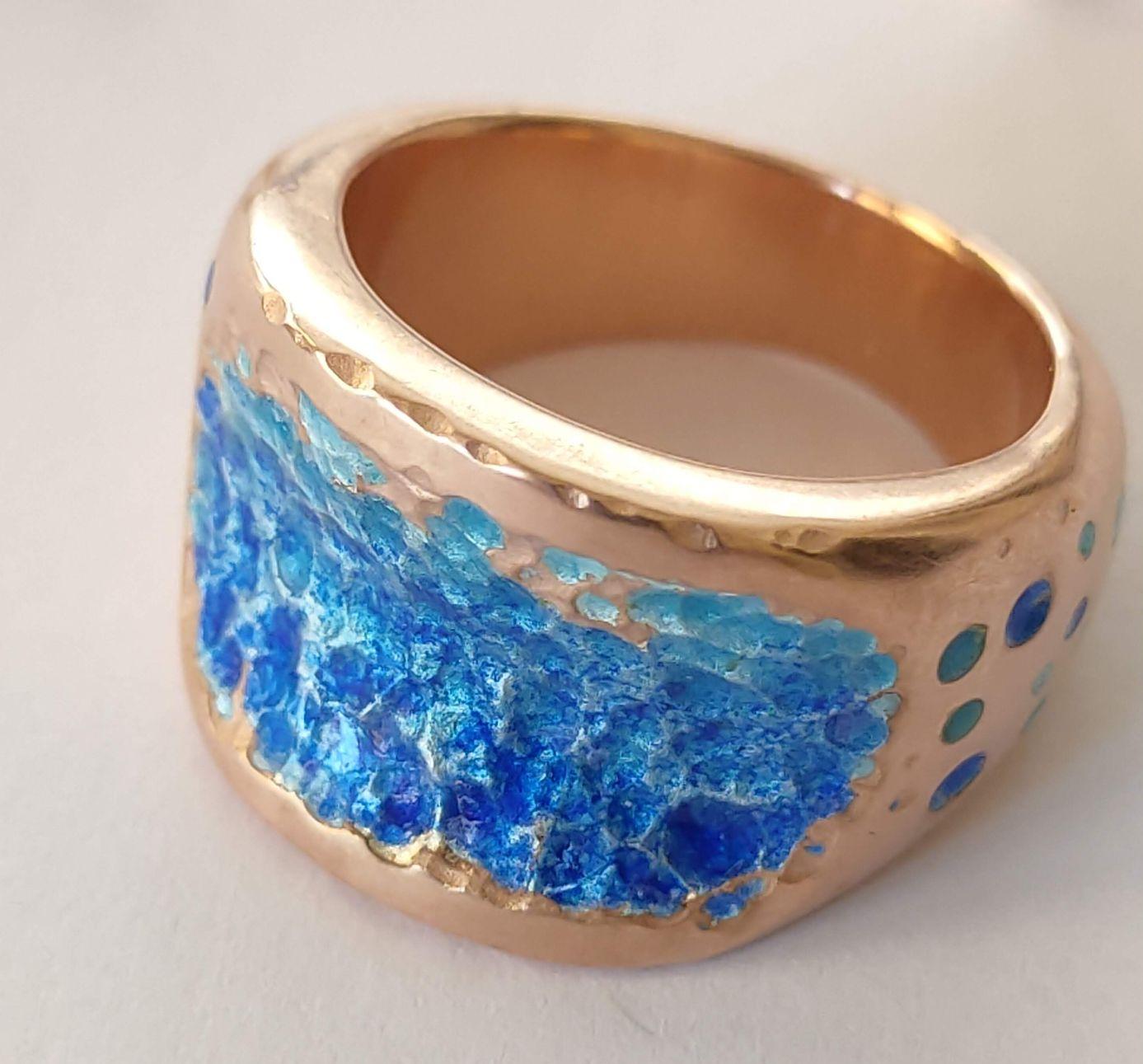 Anell artesanal realitzat amb plata de llei, banyat amb or rosa i esmaltat al foc. es la millor manera de portar un bocí del mar mediterrani, un atreviment intentar representar el color i la llum que ens transmet el mar.