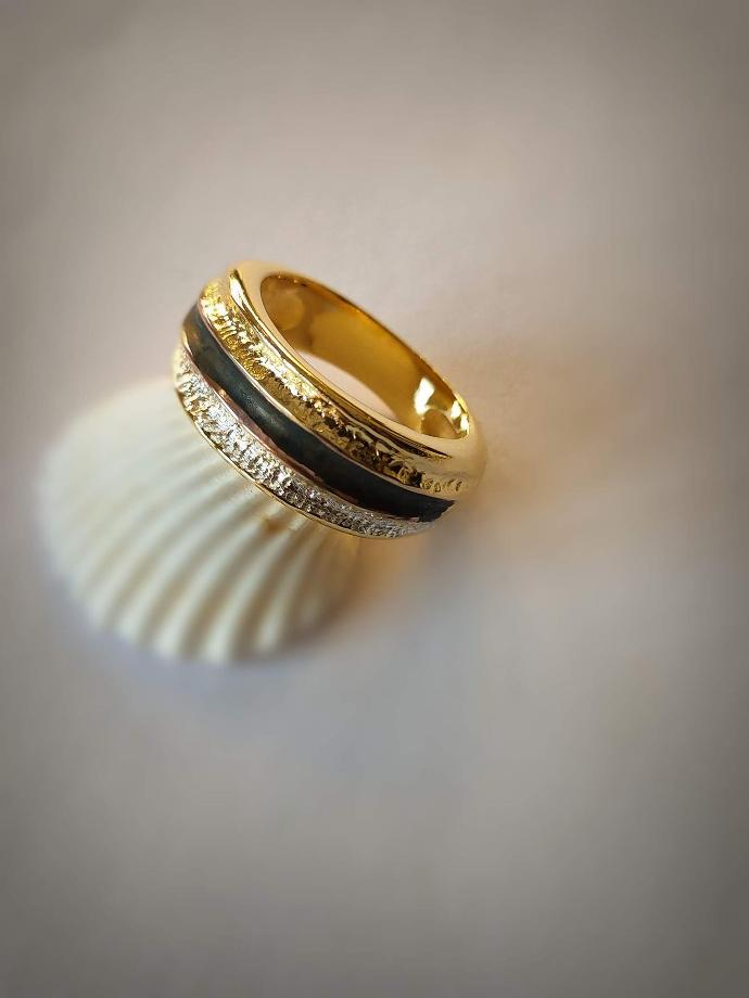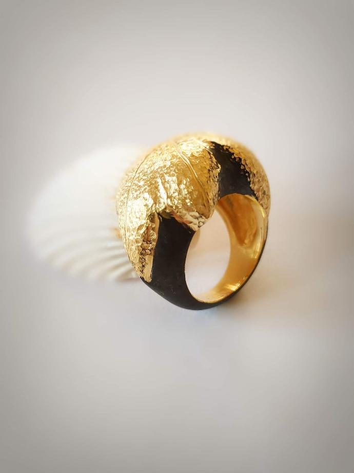 Anell artesanal realitzat amb plata de llei, esmaltat al foc, acabat amb un bany d'or,