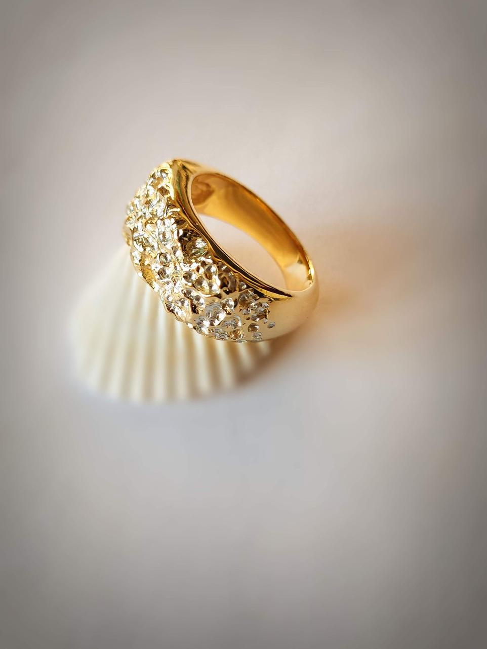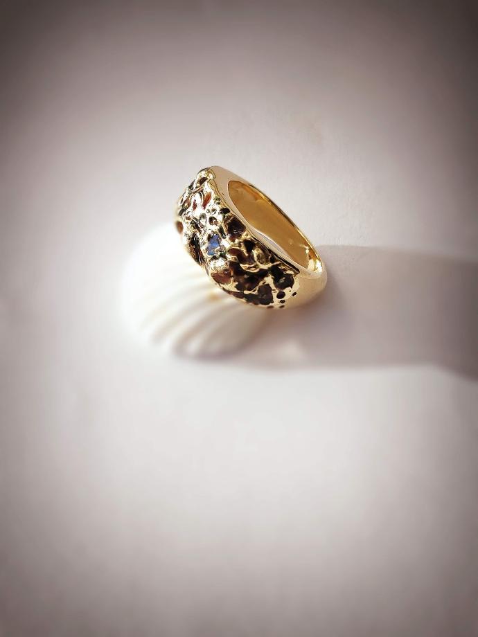 Anell artesanal realitzat amb plata de llei envellida, amb un bany d'or. La riquesa natural del fons marí, es font inesgotable d'inspiració. El seu hàbitat son les aigües salades, el teu les celebracions, porta-la i brilla tant dins com fora de l'aigua.