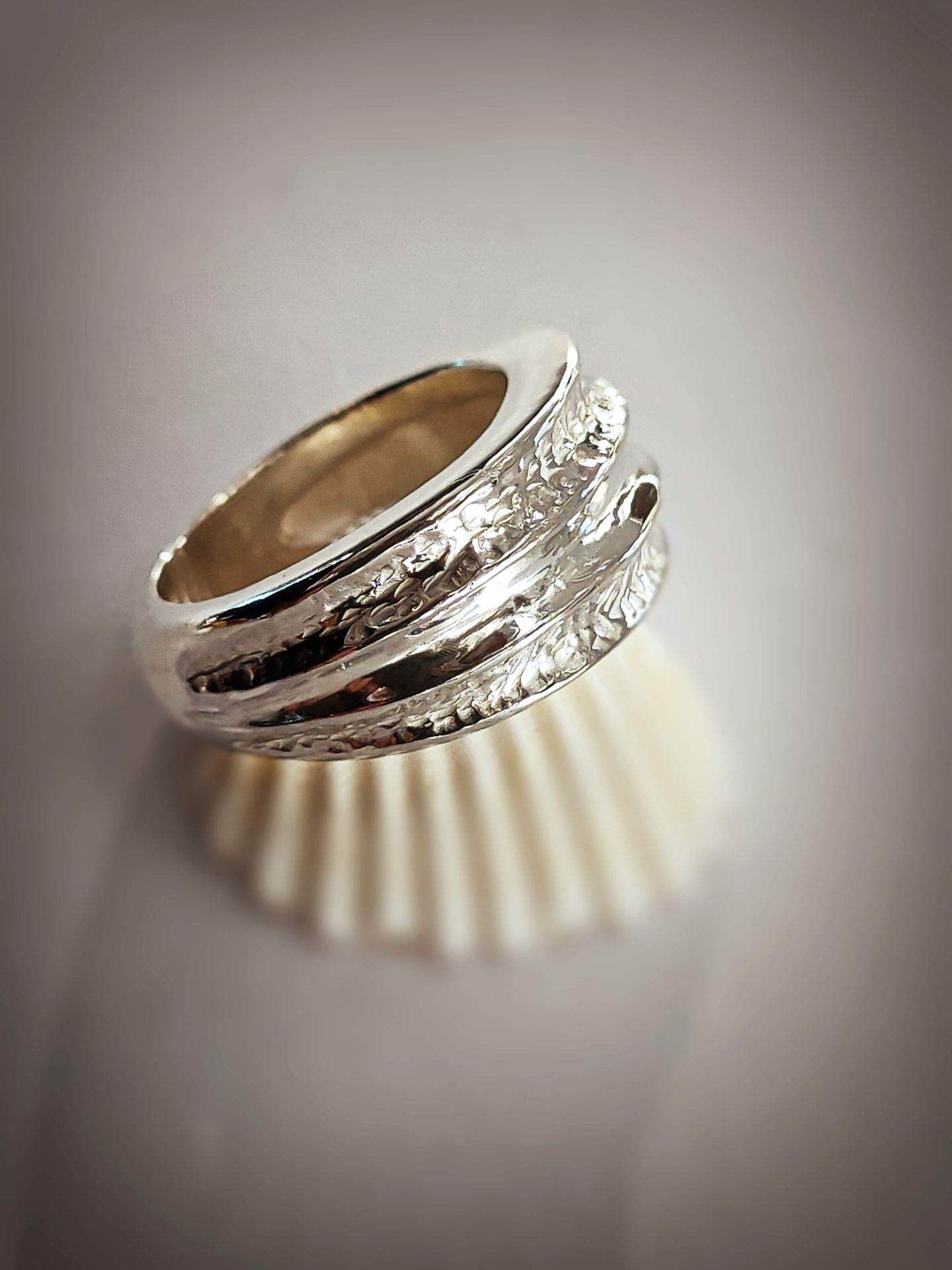 Anell artesanal realitzat amb plata de llei. Els vèrtexs que el formen defineixen formes aglutinant les diferents textures per albirar una peça única.