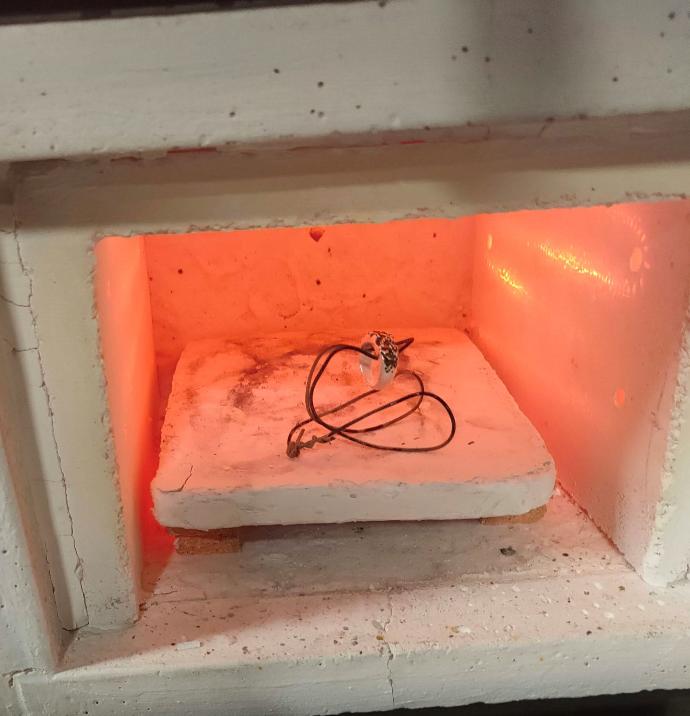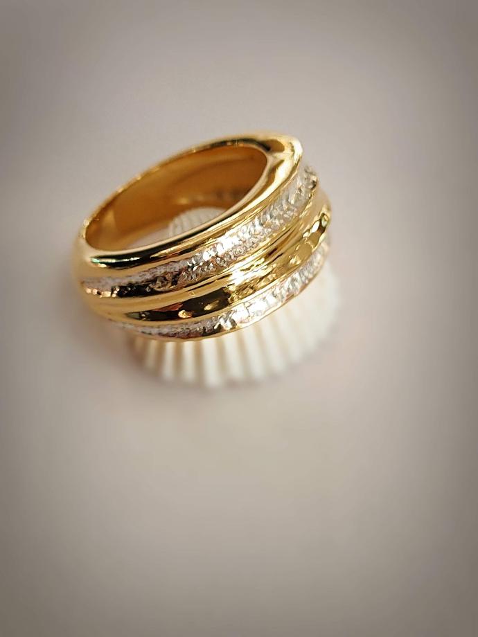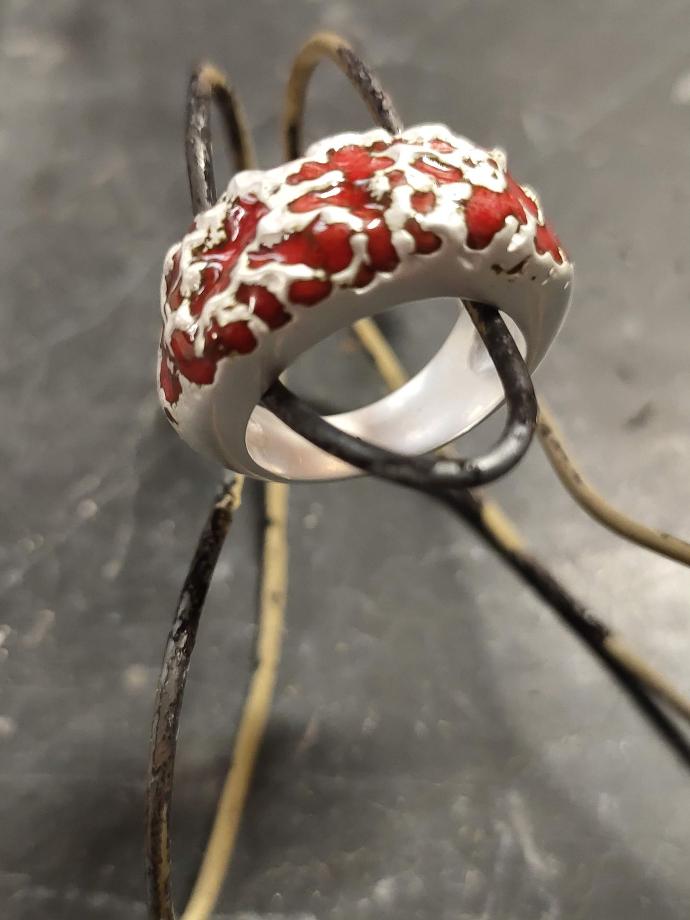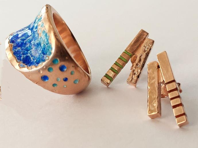Anell artesanal realitzat amb plata de llei amb un bany d'or , esmaltat al foc. Forma globular orgànica.