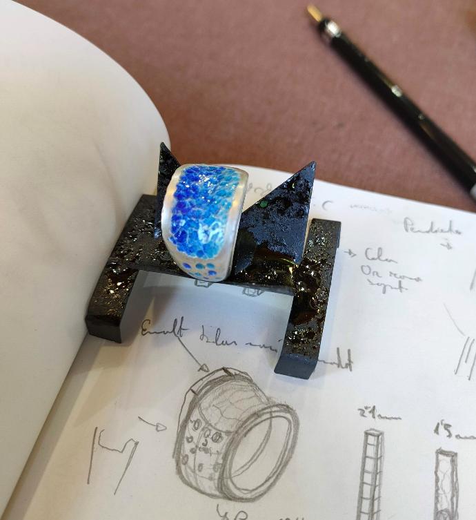 Anell realitzat amb plata de llei esmaltat al foc. Inspirat amb l'aigua turquesa de Menorca.