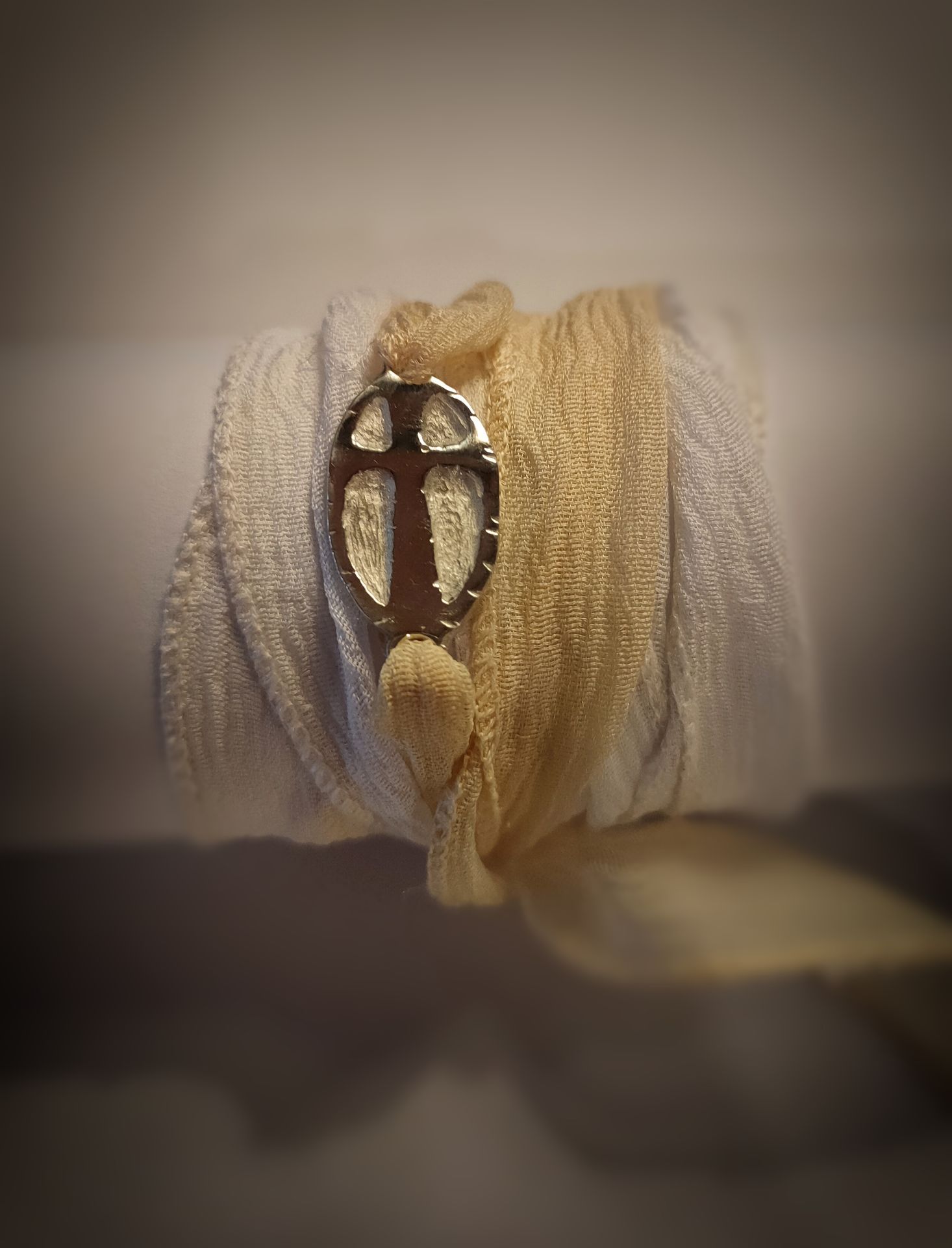 Pulsera de seda en color crudo y amarillo claro, con cruz realizada artesanalmente en plata de ley.