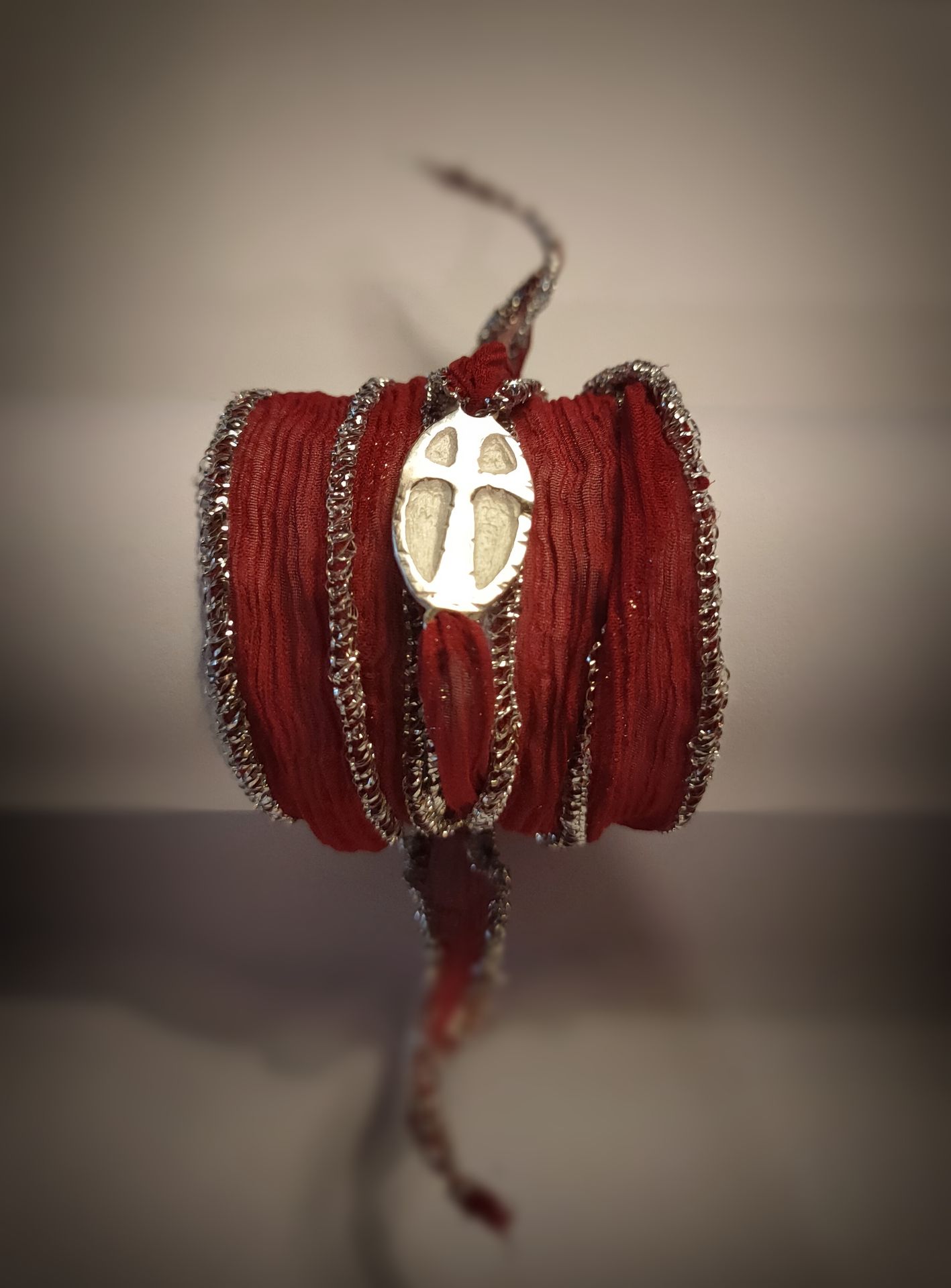 Pulsera de seda en color burdeos, con cruz realizada artesanalmente en plata de ley.